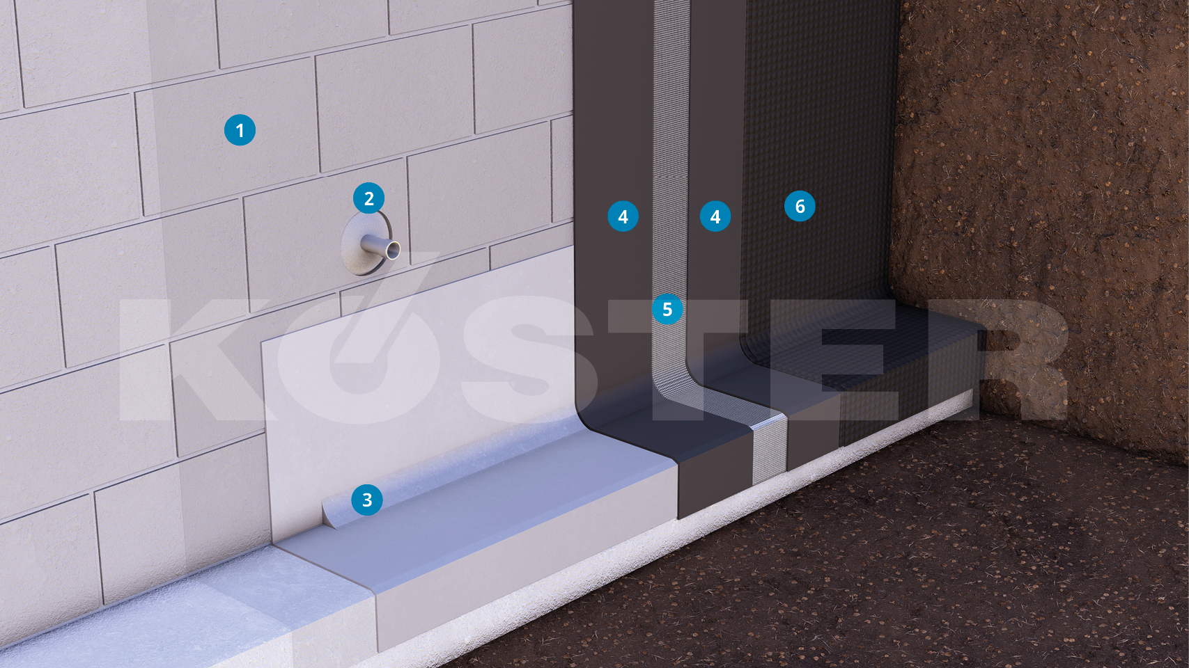 Pipe and cable penetrations are sealed with the permanently plastic putty KÖSTER KB-Flex 200 and protected by a layer of KÖSTER KB-Fix 5. Alternatively, these areas can be connected with a fillet of the respective thick film sealant or fitted with flanges.
