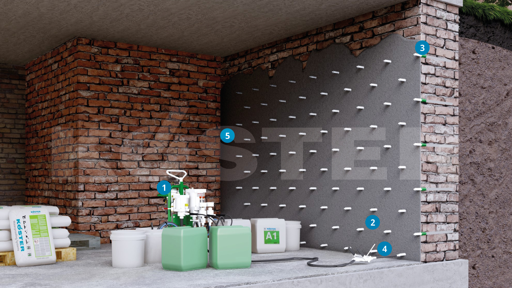 KÖSTER Injection Gel G4 is injected in multiple phases until a pressure resistance is achieved. Afterwards, the packer holes are filled with KÖSTER KB-Fix 5. For a decorative and functional surface design, KÖSTER Restoration Plasters can be applied over the KÖSTER Injection Barrier.