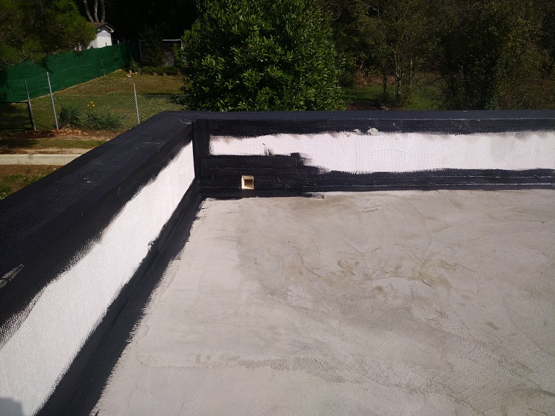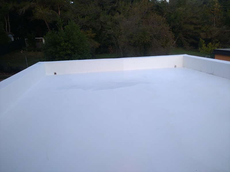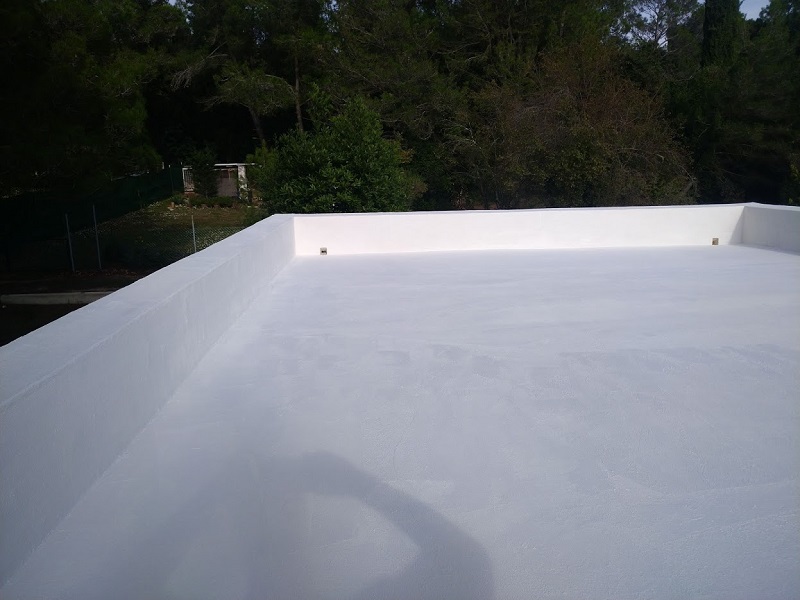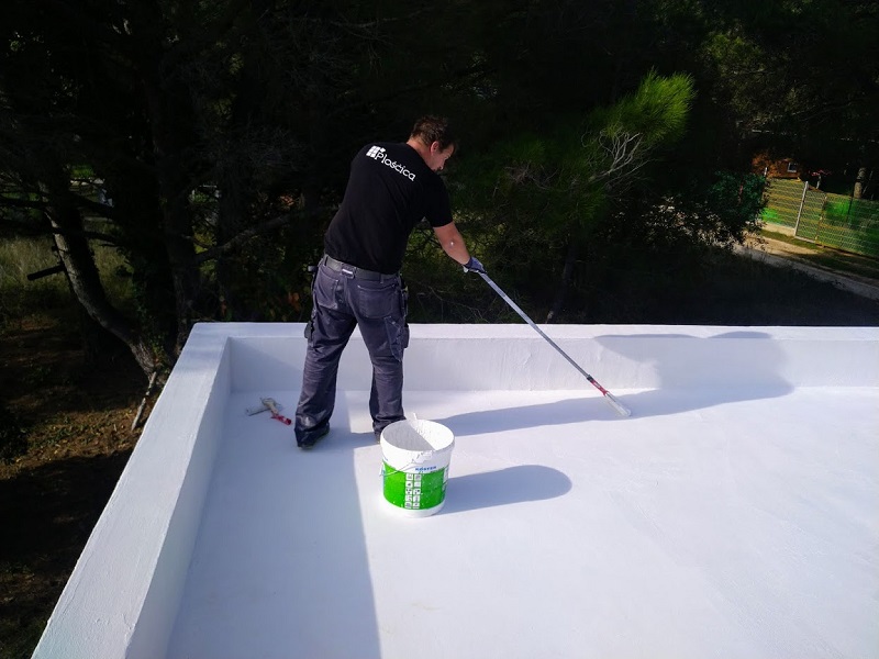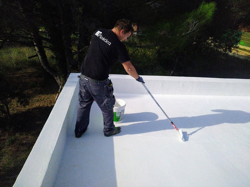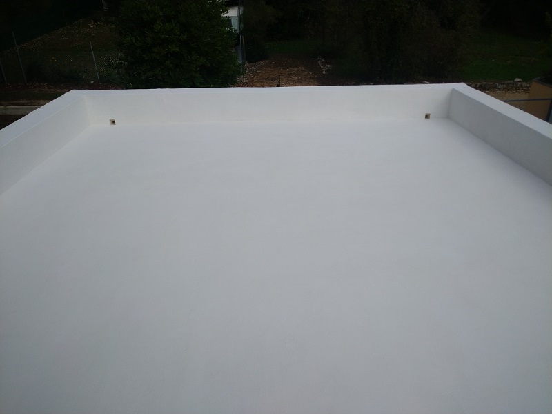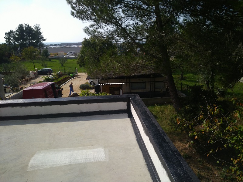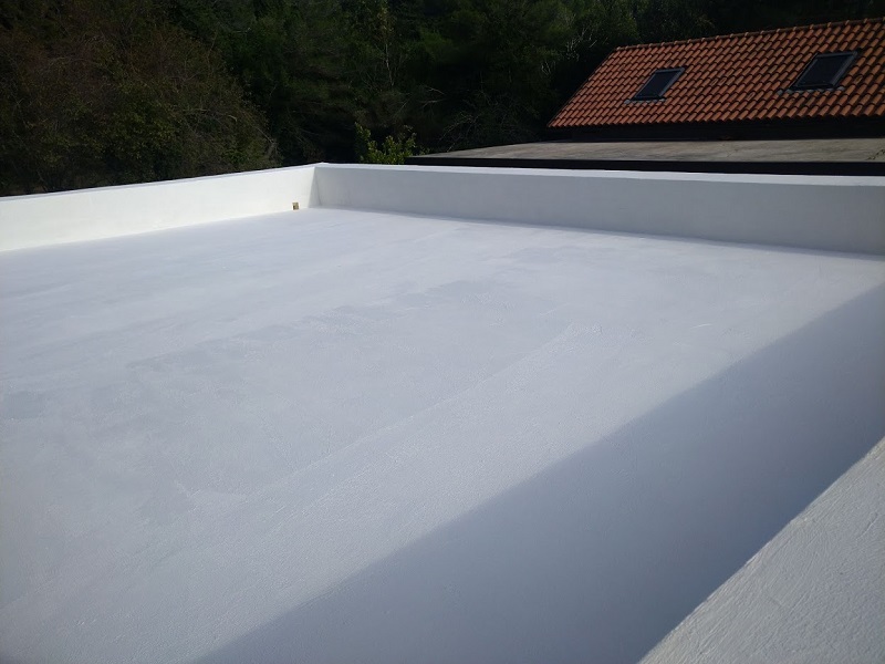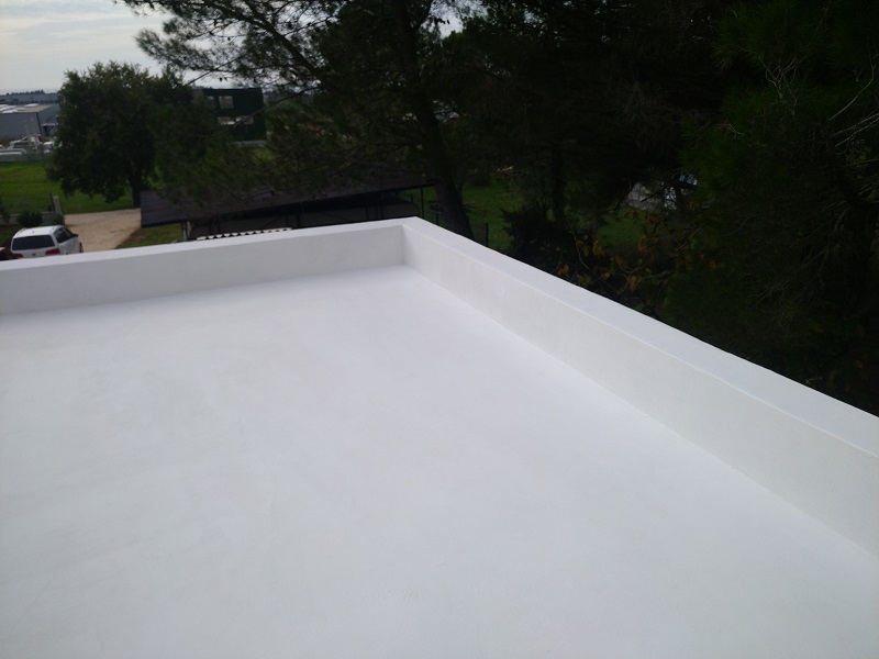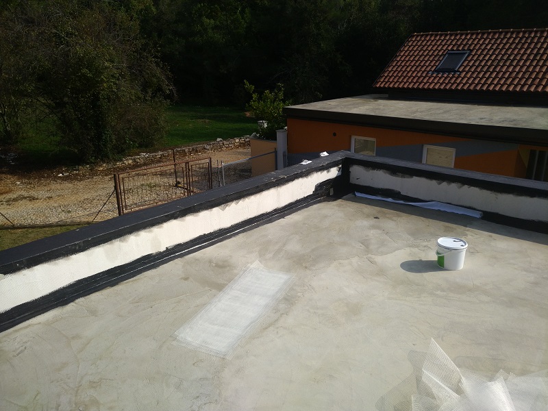 Tako je bila izvedena brezšivna, paropropustna in vodotesna hidroizolacija, ki zaradi svoje bele barve odbija velik del toplote in omogoča, da so spodnji prostori prijetno hladni.