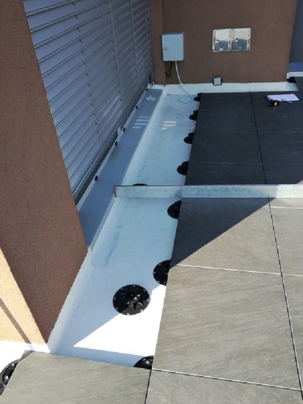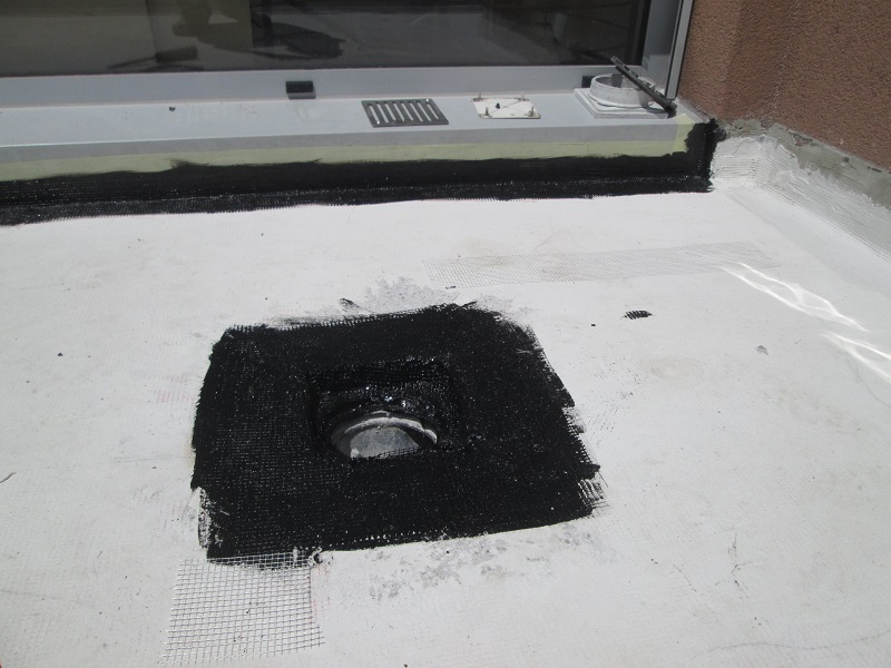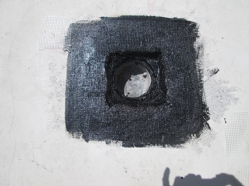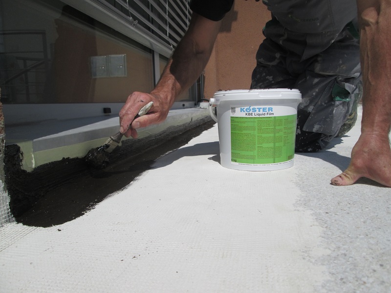 Sledila je vgradnja hidroizolacije. Na celotni površini se je naredil premaz s KÖSTER 21 v kombinaciji s KÖSTER armirno mrežico. Za tesnitev detajlov in stavbnega pohištva (npr. del, kjer je ograja pritrjena na površino, balkonska vrata) so uporabili KÖSTER KBE-tekočo folijo in KÖSTER Super flis.