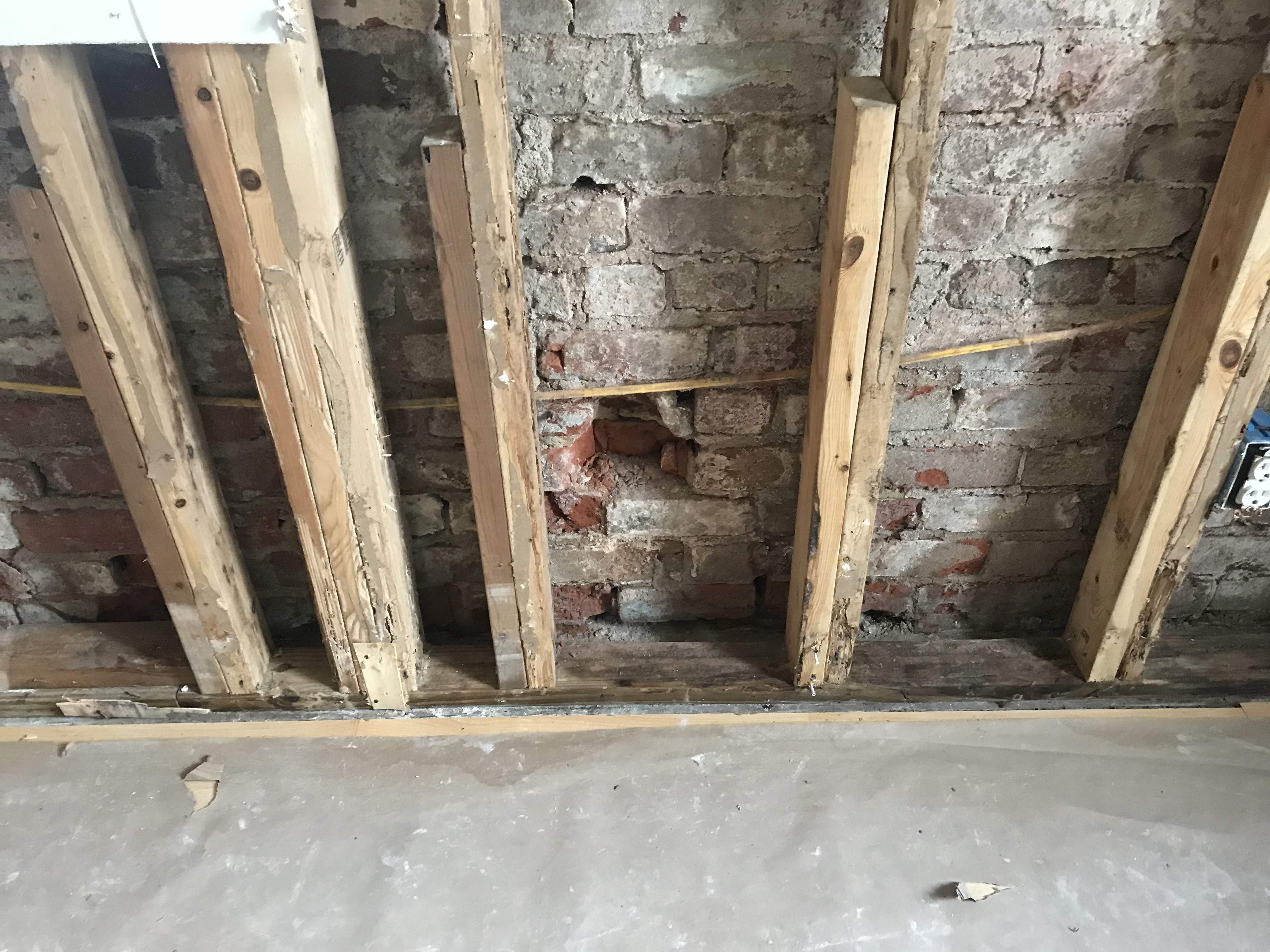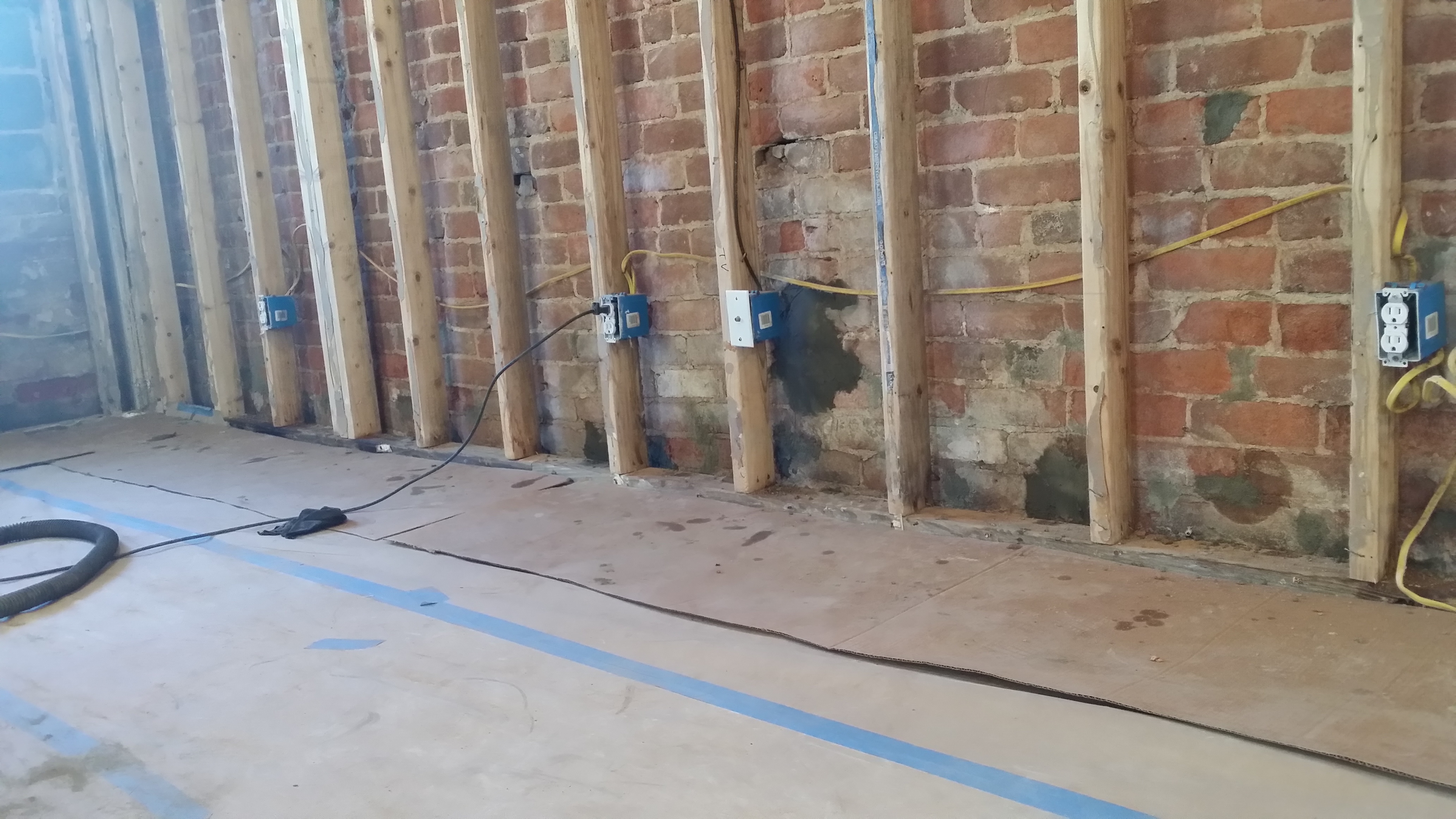 The building was renovated and turned into a residential building in 2009. The walls were studded and sheet-rock was installed. Over time, mold developed behind the sheet-rock and studding began to deteriorate. After removal of the sheet-rock, it was evident there were multiple issues that needed to be addressed. Rising damp from the foundation was evident, as well as damaged facing of the brick and mortar. There was also water penetration on the north side of the building that was slightly below grade.