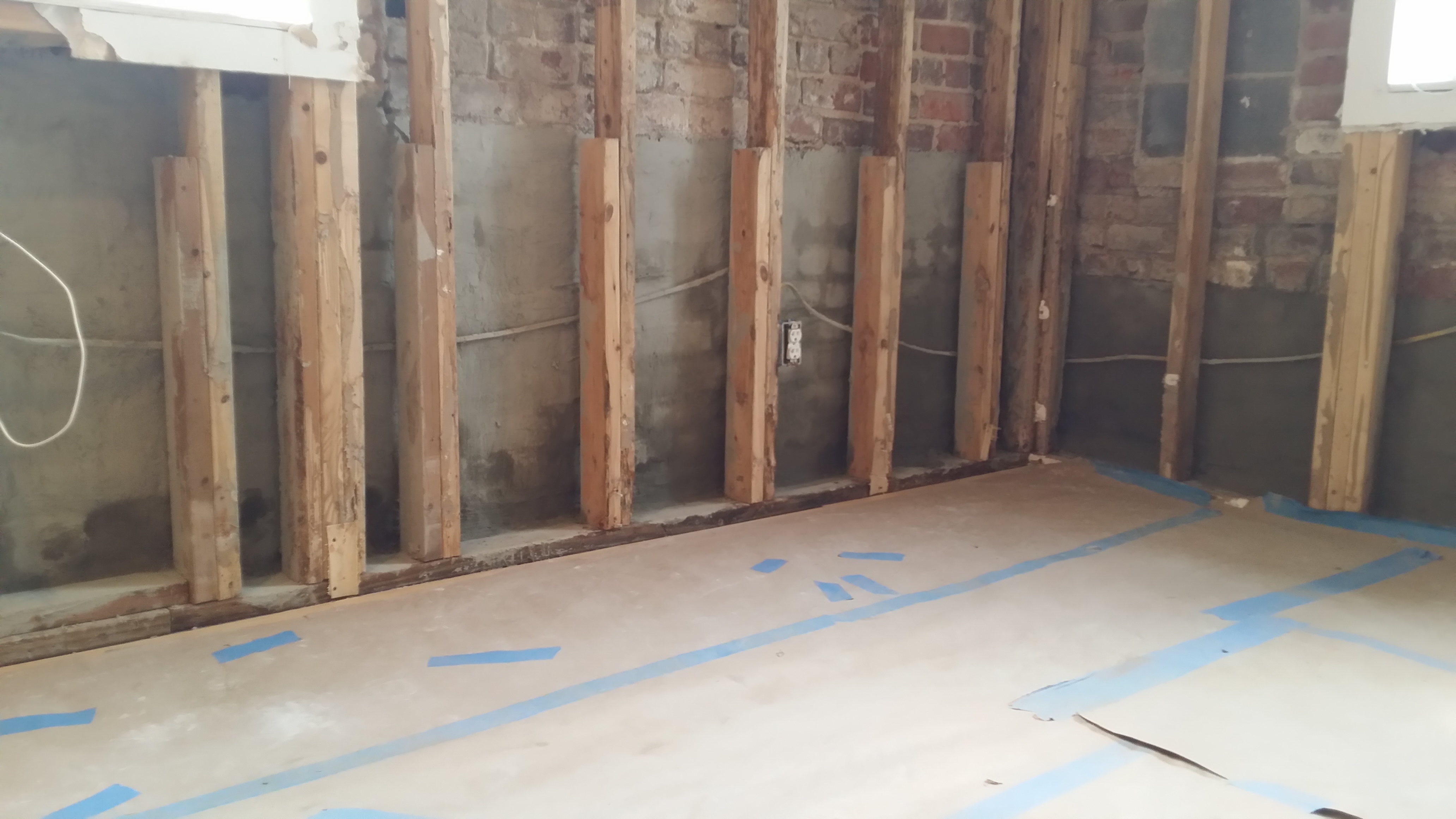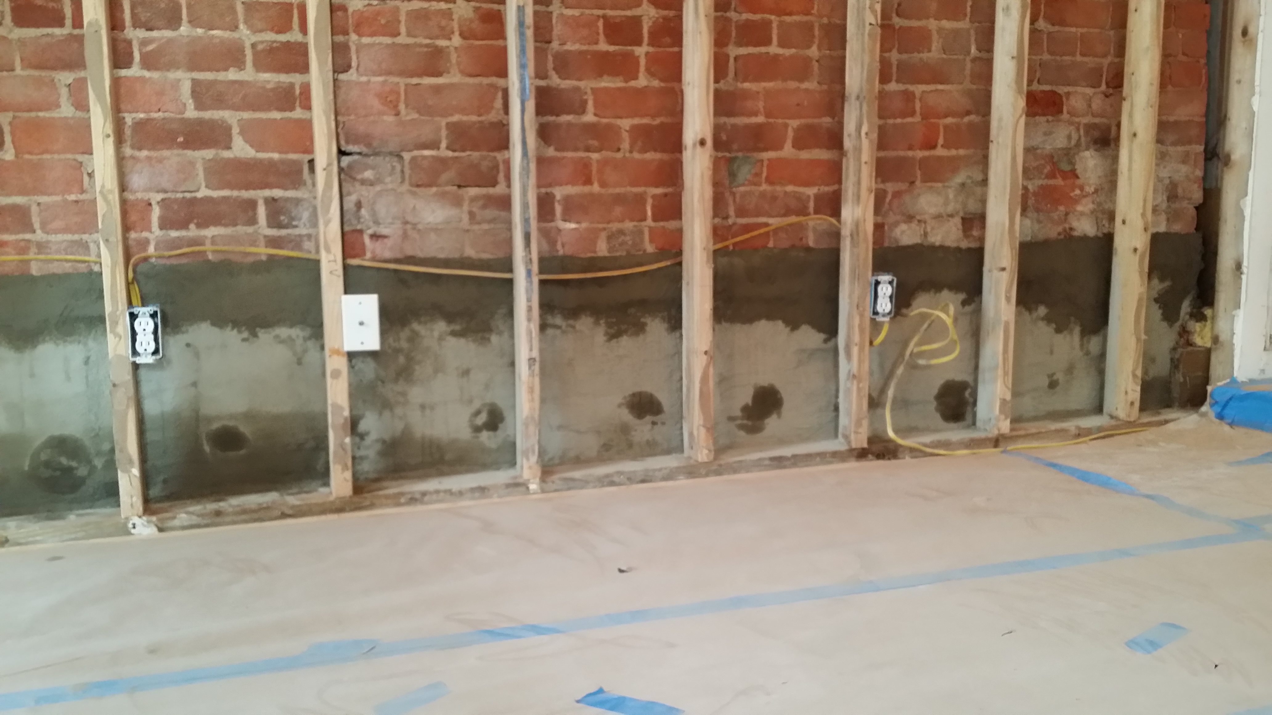 Problem to be Solved: The building was renovated and turned into a residential building in 2009. The walls were studded and sheetrock was installed. Over time, mold developed behind the sheetrock and studding began to deteriorate. After removal of the sheetrock, it was evident there were multiple issues that needed to be addressed. Rising damp from the foundation was evident, as well as damaged facing of the brick and mortar. There was also water penetration on the north side of the building that was slightly below grade.