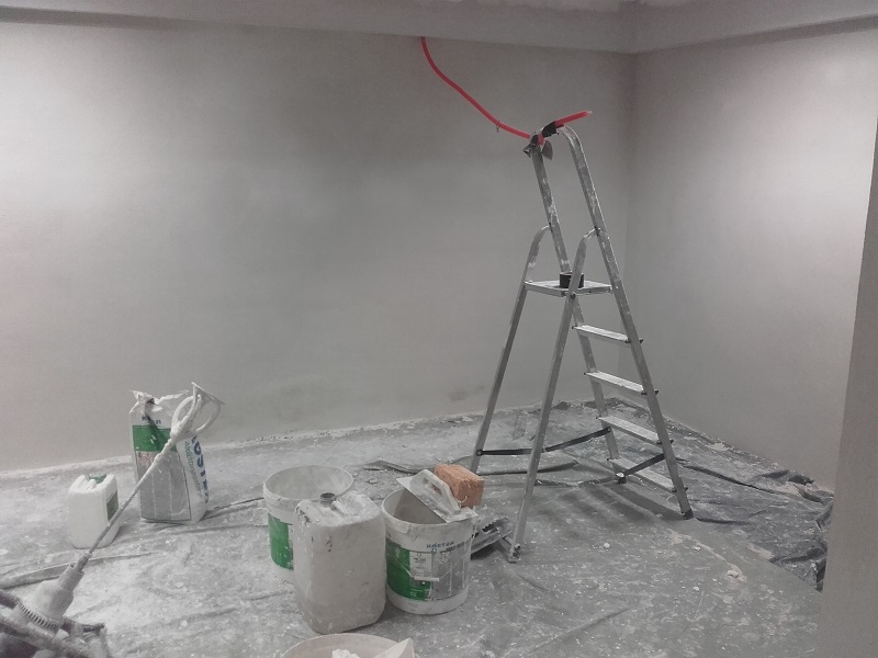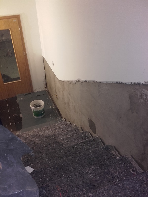 Iz sten so odstranili star omet in gips plošče, steno zbrusili in očistili, s Köster Crisin kremo naredili horizontalno bariero proti kapilarnemu dvigu vlage. Ko je bila narejena horizontalna bariera so preko naredili še tesnilni sistem s Köster Polysil TG 500 in Köster NB 1. Prav tako so rešili in pravilno zatesnili preboje, ki so bili dodaten vir zamakanja v objekt. Kjer je bilo potrebno so steno izravnali in lokalno popravili z izdelkoma Köster KB-Fix 5 in Köster Betomor Multi A. Ko je bila stena sanirana, so nanesli Köster sanirni omet in za fino zagladitev še Köster Fini omet. V prostorih, ki so bili obremenjeni s plesnijo pa so stene še dodatno prebarvali s Köster MF 1, mineralno barvo, katera preprečuje pojav in nastajanje plesni.
