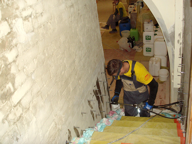 Uszczelnienie ścian piwnic w technice iniekcji strukturalnej żelem akrylowym. Zawilgocone i przeciekające ściany piwnic zostały zagruntowane preparatem KOSTER POLYSIL TG 500 oraz uszczelnione szlamem uszczelniającym KOSTER NB1. Następnie wykonano iniekcję strukturalną ścian żelem akrylowym KOSTER INjektionsgel G4 oraz system szerokoporowych tynków renowacyjnych KOSTER Sanierputz.