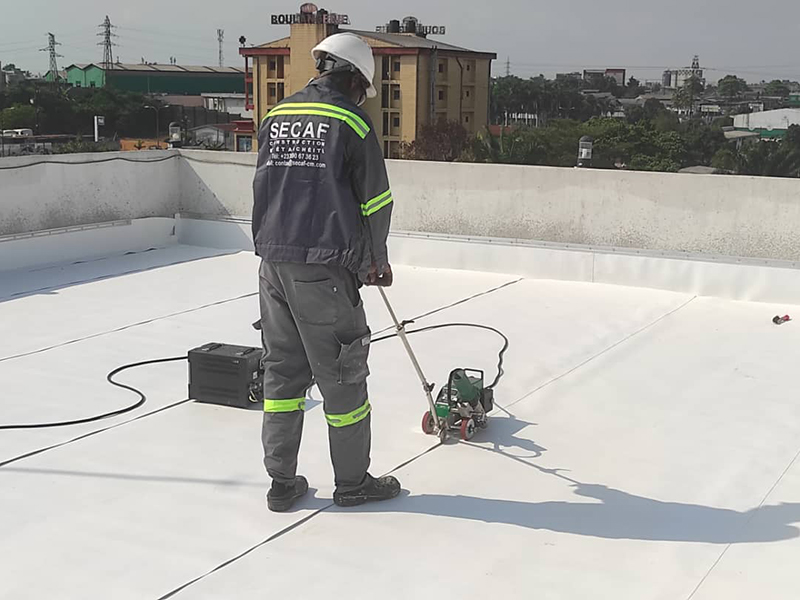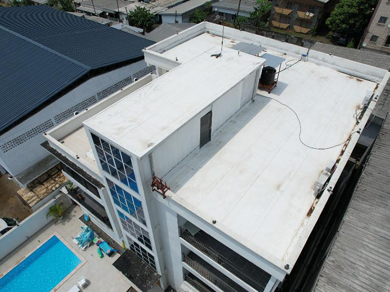 Waterproofing renovation of a terrace including: - Slope correction using a cement mortar modified with KÖSTER SB Bonding for improved adhesion and reduced cracking - Installation of KÖSTER TPO membrane system by hot-air welding to ensure long-term waterproofing of the roof slab