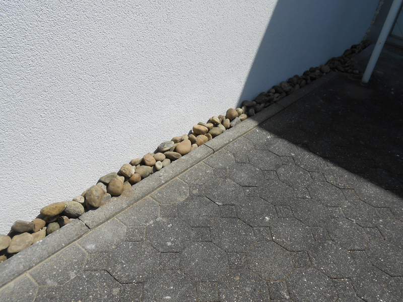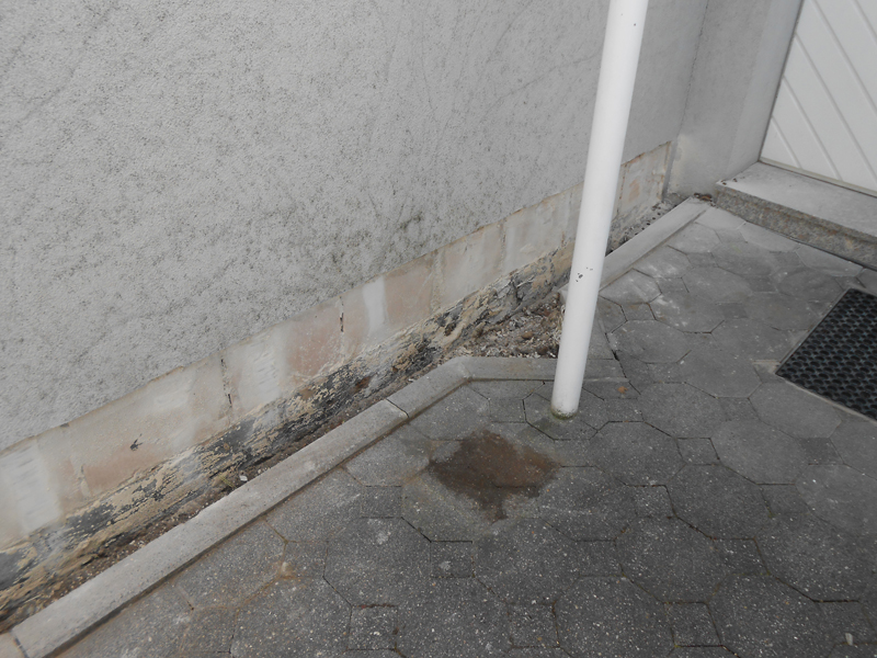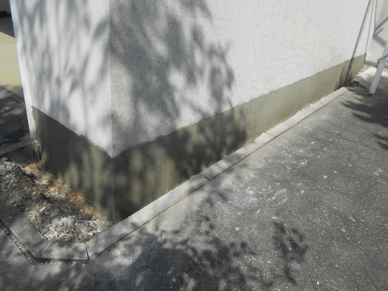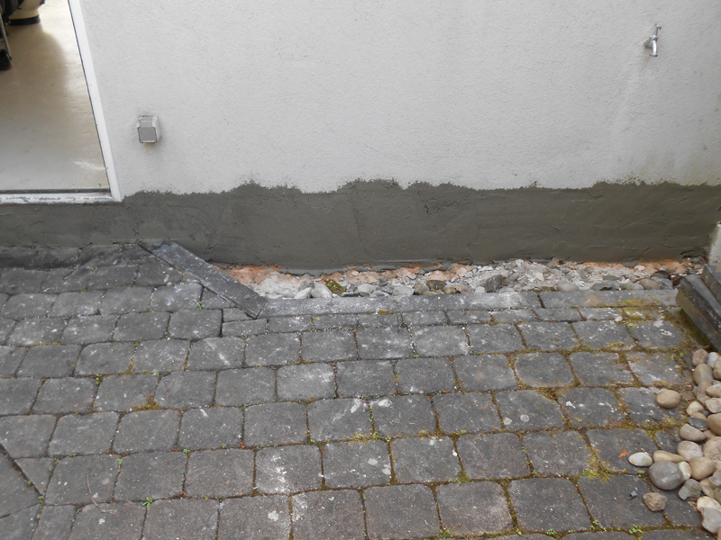 Durch das Fehlen eines Spritzwasserschutzes konnte jahrelang Feuchtigkeit ins Mauerwerk eindringen und Schäden verursachen. Nach der Entfernung des Altputzes und dem Anbringen einer Hybridabdichtung ist ein dauerhafter Schutz des Mauerwerks gewährleistet.