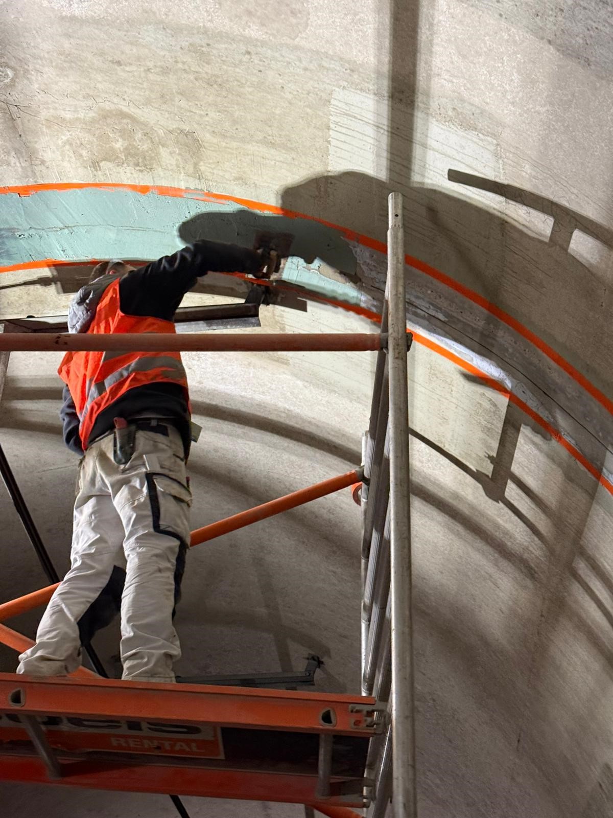 Der Untergrund wurde zuvor durch Fräsen von haftmindernden Stoffen befreit und damit vorbereitet. Anschließend wurde dieser mit KÖSTER Polysil TG 500 grundiert, Unebenheiten und Ausbrüche wurden mit KÖSTER Schachtmörtel egalisiert. Anschließend erfolgte eine Kratzspachtelung mit KÖSTER NB 4000, danach wurde die erste Lage NB 400 aufgetragen und das Fugenband 250 eingebettet. Zum Abschluss wurde eine zweite Lage NB 4000 aufgespachtelt.