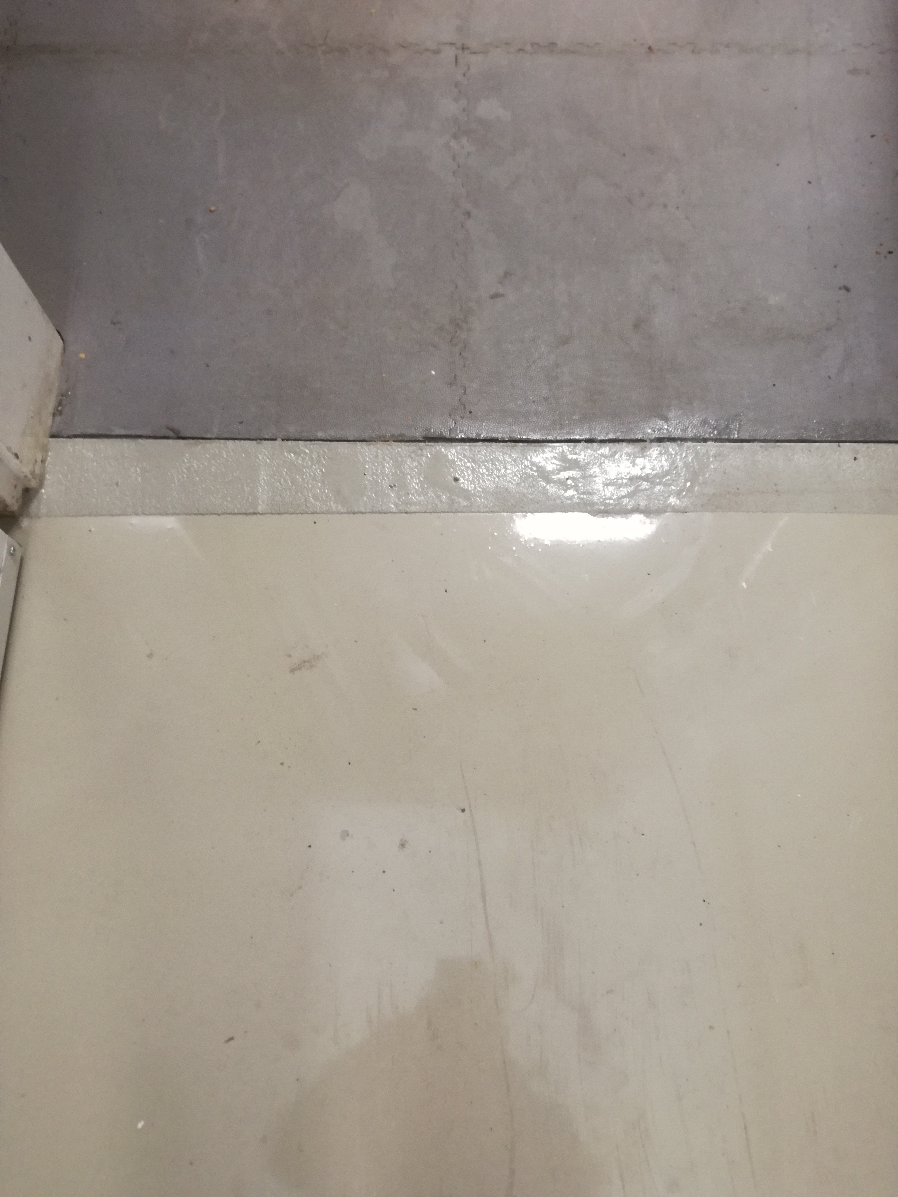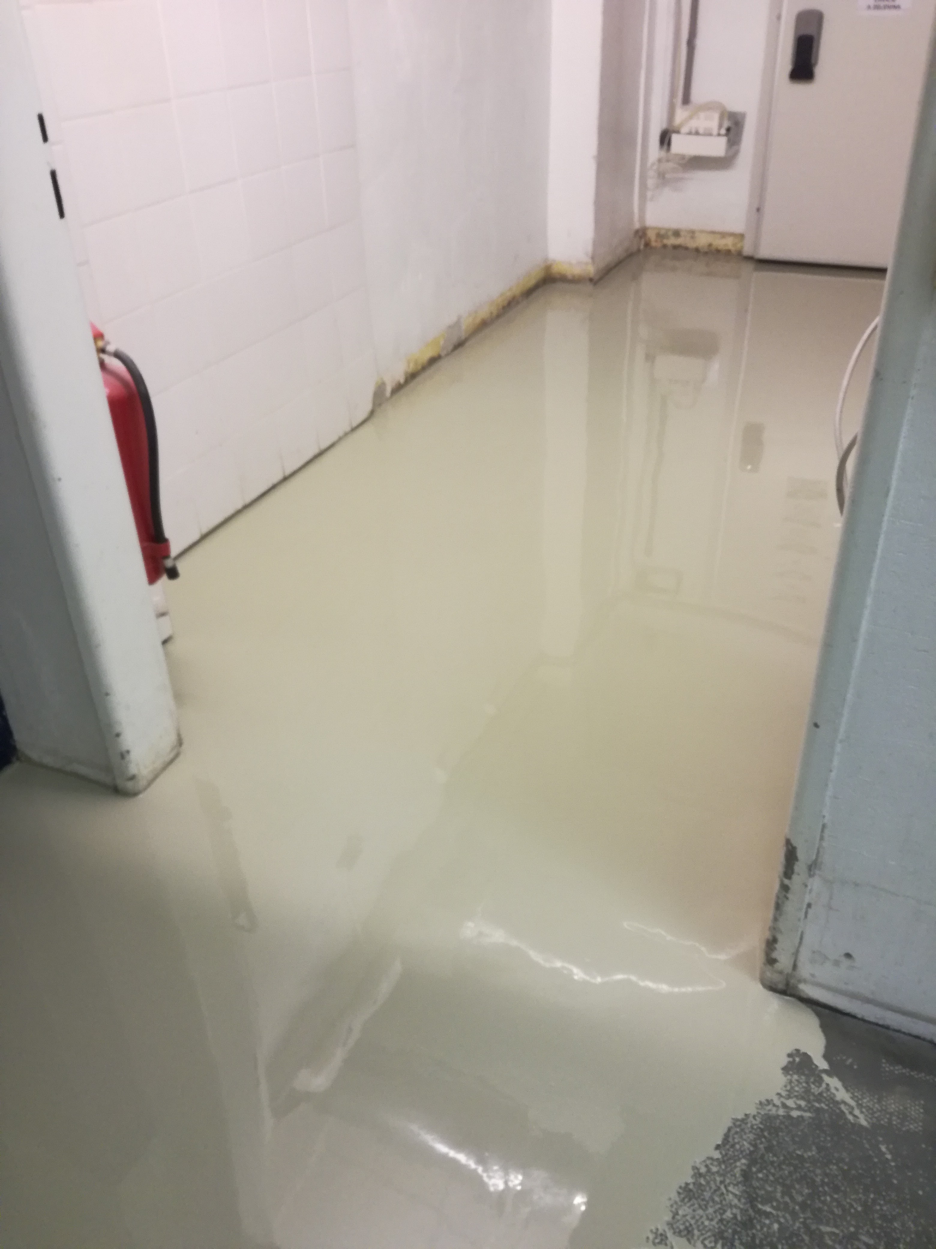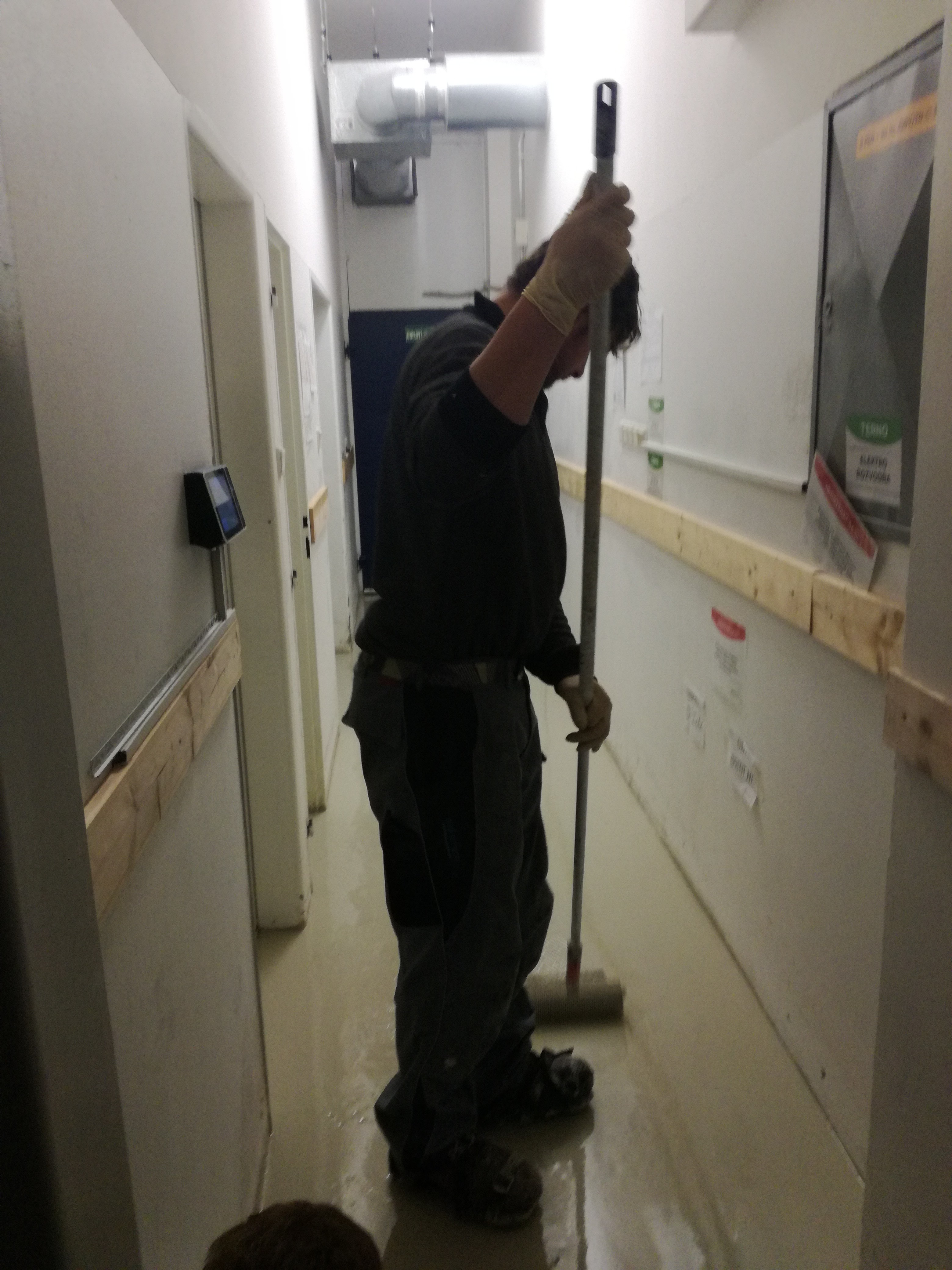 Odstránenie starých povlakov, oprava podkladu s epoxidovou maltou Köster Construction resin a kremičitými pieskami, liata podlaha Köster LV-VL, náter soklov Köster EM-VS / Removal of old coatings, repair and leveling of epoxy mortar Köster Construction resin and quartz sand, Köster LV-VL flooring, Köster EM-VS plinth coating