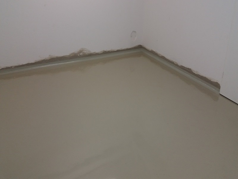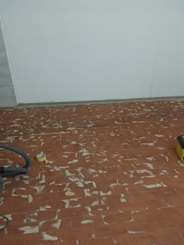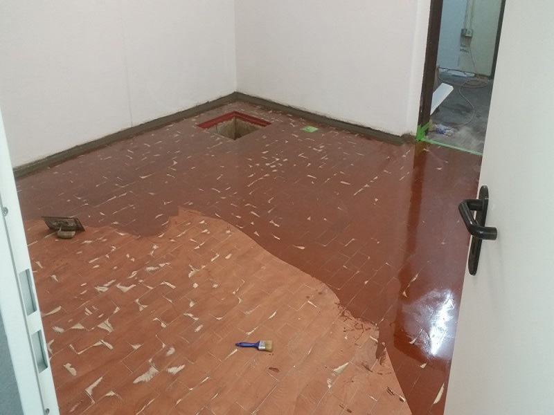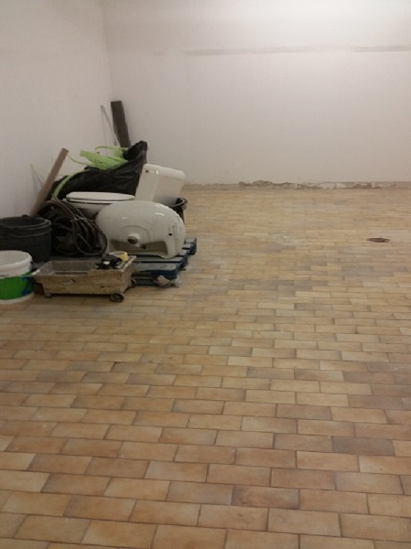 Izvedlava epoksidnega tlaka preko keramike. Hidroizolacija predhodno ni bila narejena, zato je bilo potrebno narediti parno bariero. Podlago je bilo najprej potrebno pripraviti z brušenjem obstoječe keramike ("odpiranje" podlage).