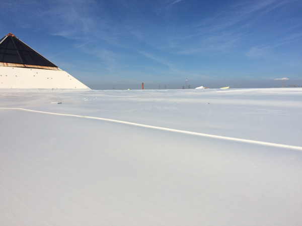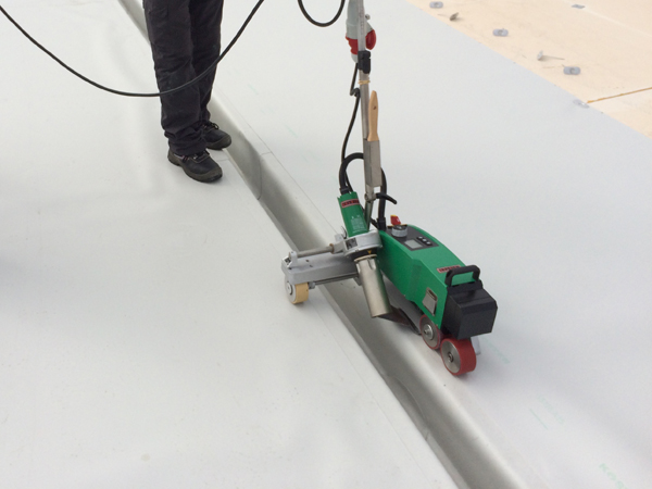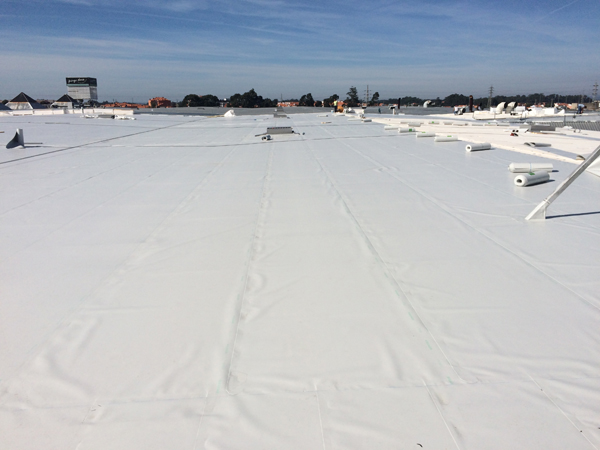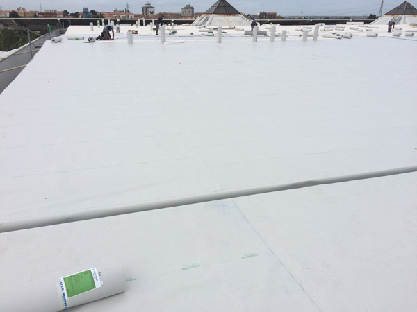 Cobertura com 22 000 m2 era sistema de fixação mecânica sobre isolamento térmico P.I.R. previamente fixado mecanicamente à estrutura metálica da cobertura do edifício.