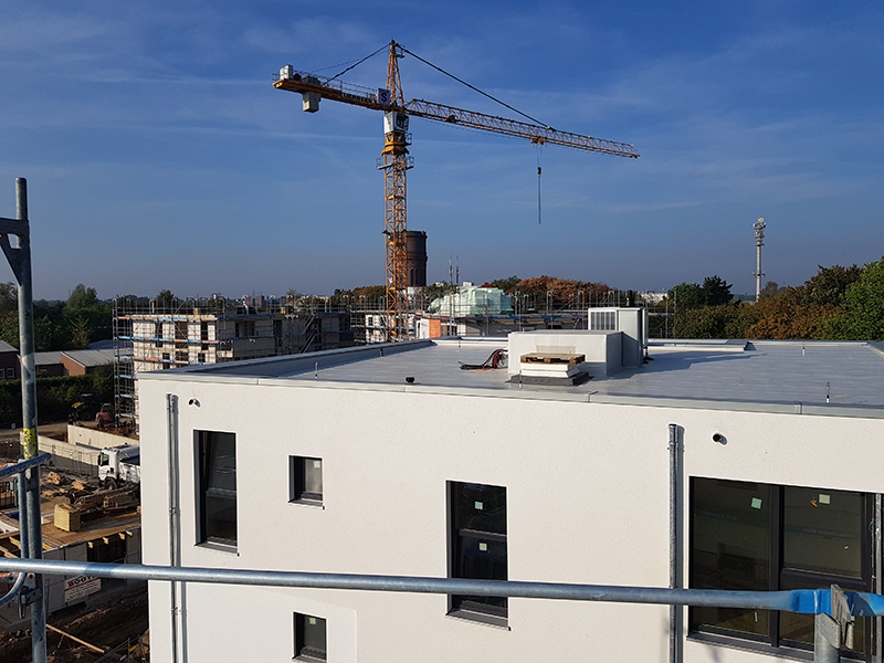 Mehrere Mehrfamilienhäuser mit Staffelgeschoss und Balkonen, freibewittert und mit Auflast. Tragdecke Stahlbeton, Dachaufbau als Warmdach mit EPS-Gefällewärmedämmung.